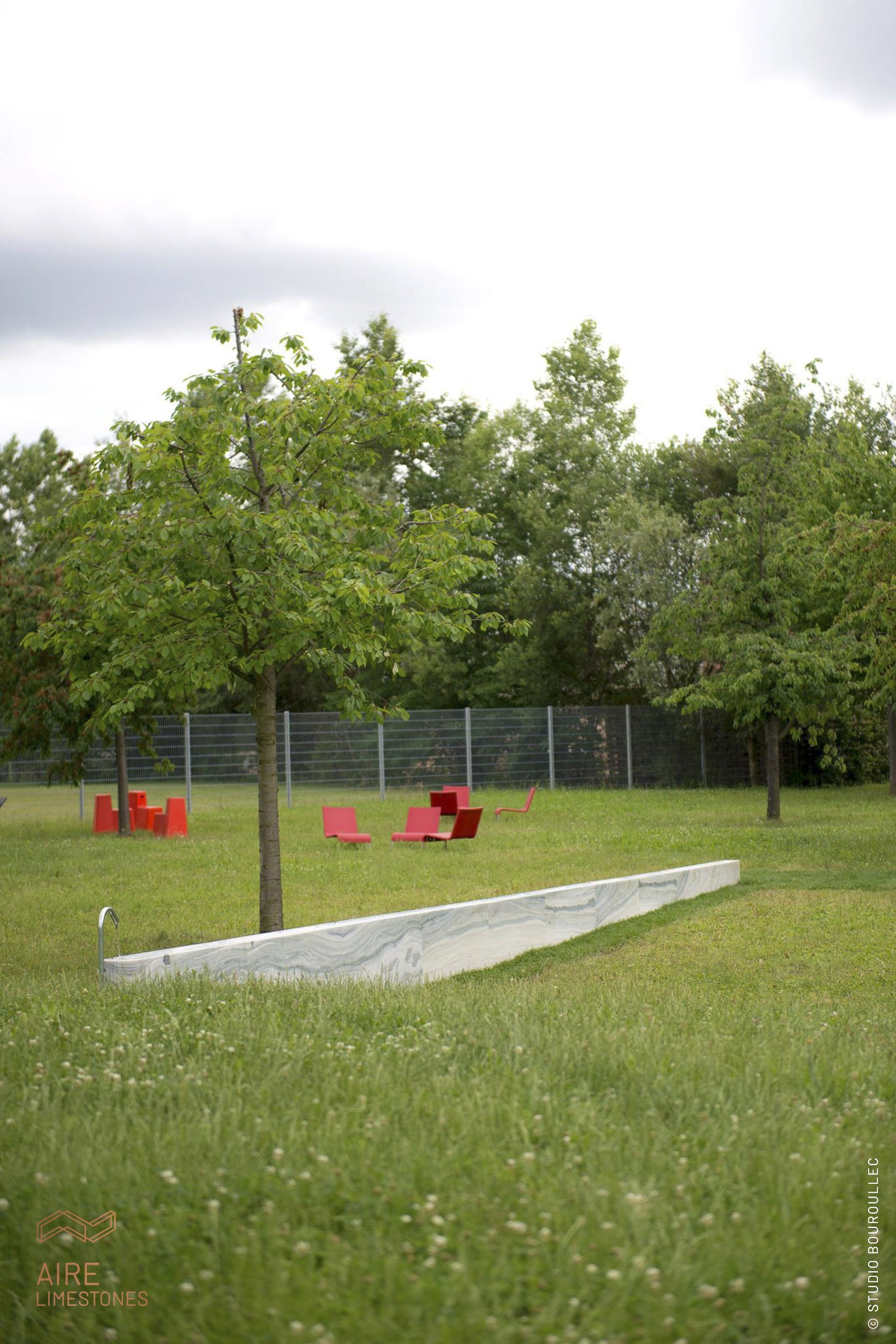 This edition of FONTAINE, created specifically for the Vitra Campus, differs from the original version, which was conceived in the scope of the Common Sense project, in two central ways: instead of Rosa sem Veios marble, the designers chose the more unusual Verde Serpa marble, and the scale of the piece was also significantly changed, increasing from 8 to 16 metres in length.