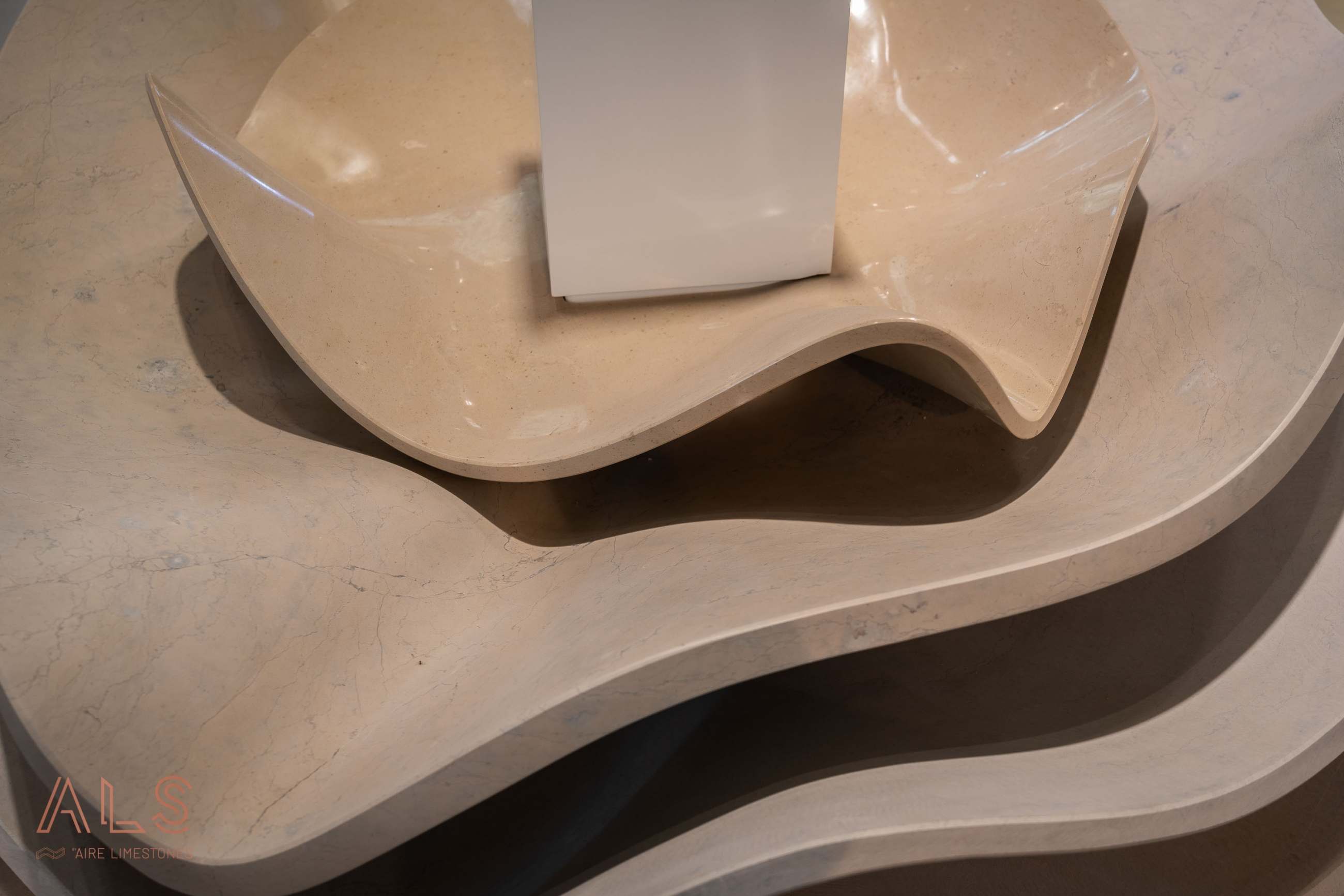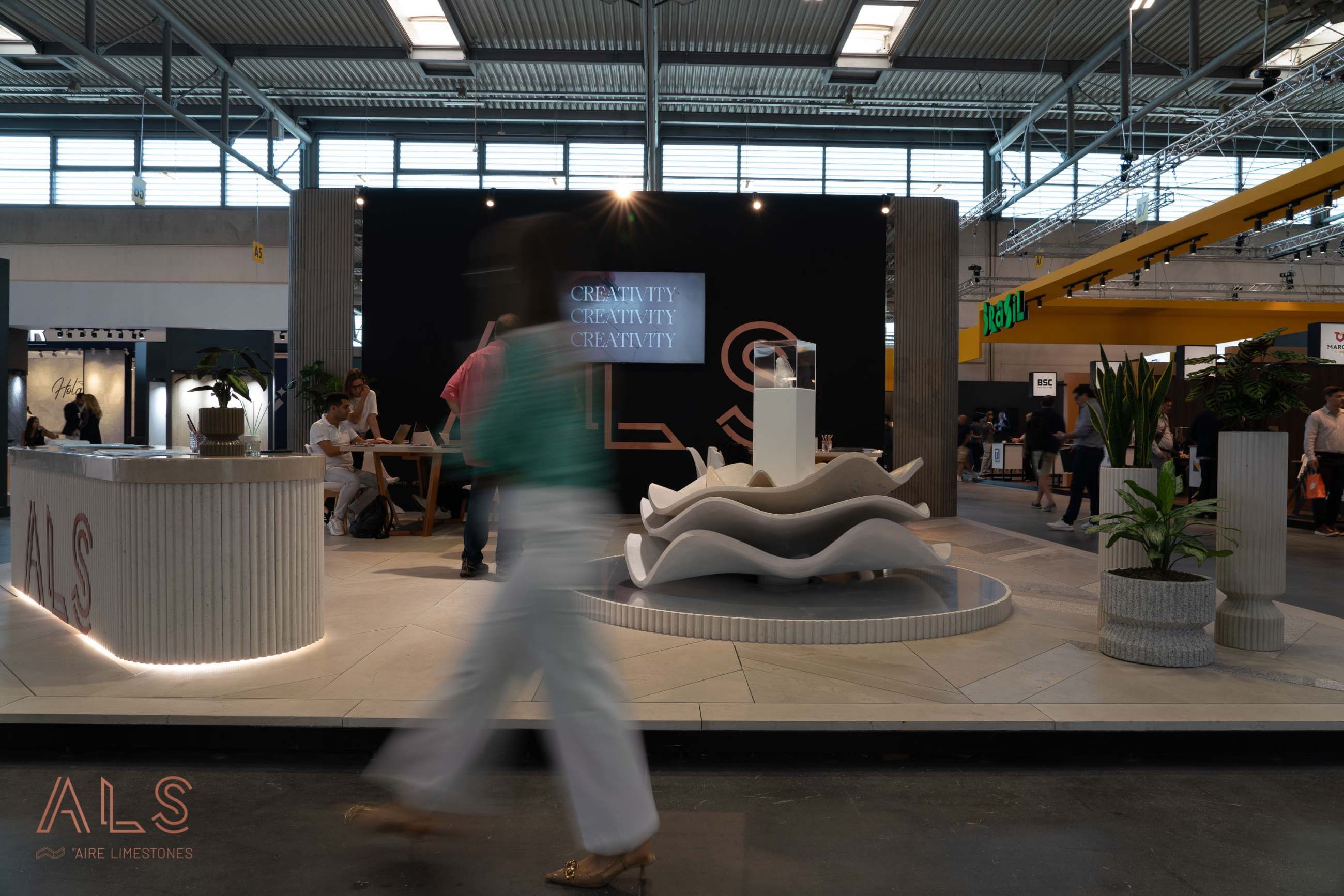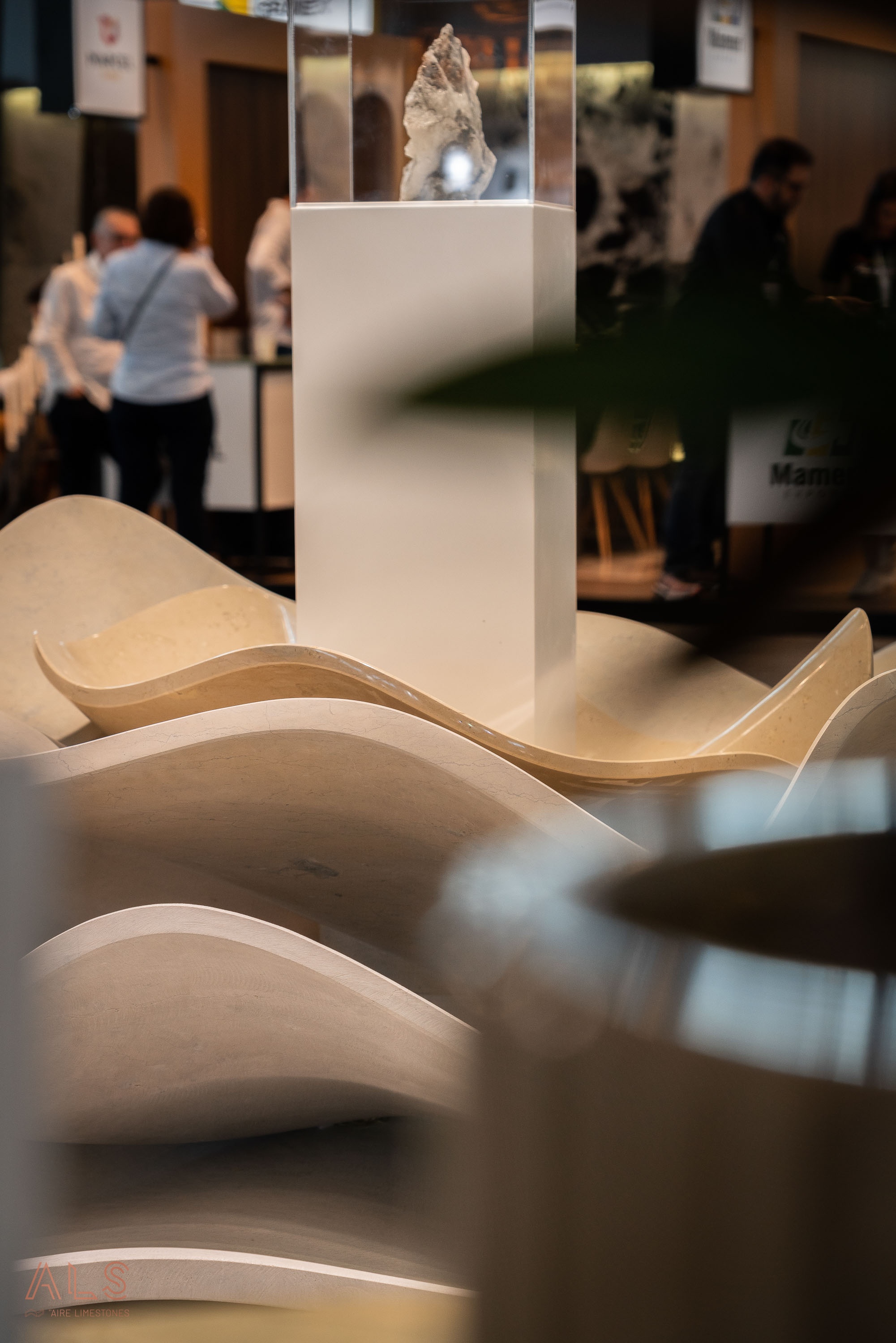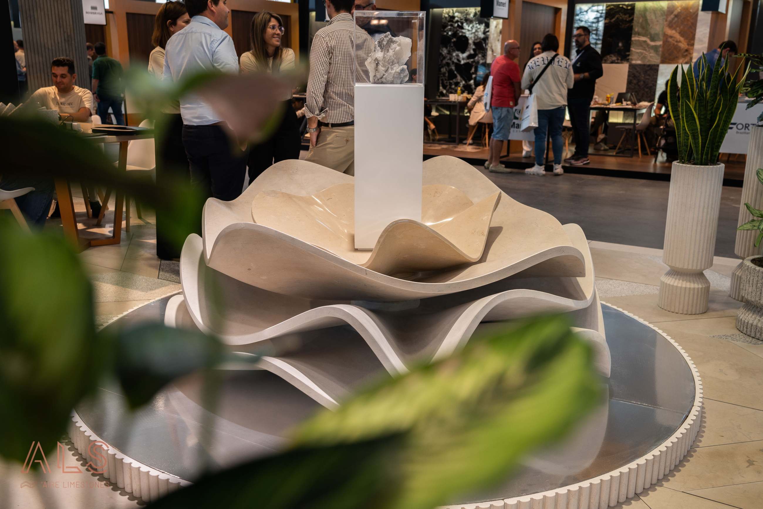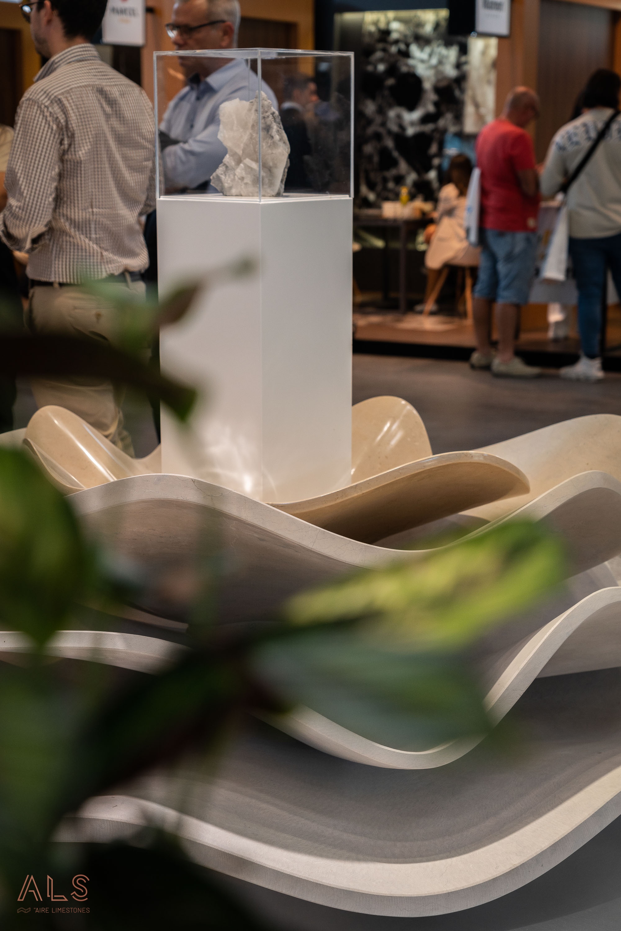 From our quarries to the transformation, the sculpture entitled "From Origin to Masterpiece" is dedicated to what we hold most precious: NATURAL STONE. Driven by challenges and unique projects, we created a metamorphosis from four massive blocks that conveys a sense of movement, lightness, and unexpected fluidity, thus defying the natural characteristics of natural stone. Undoubtedly, it is an immersive and engaging experience, highlighting the beauty of natural stone amid textures, stone types, and finishes.