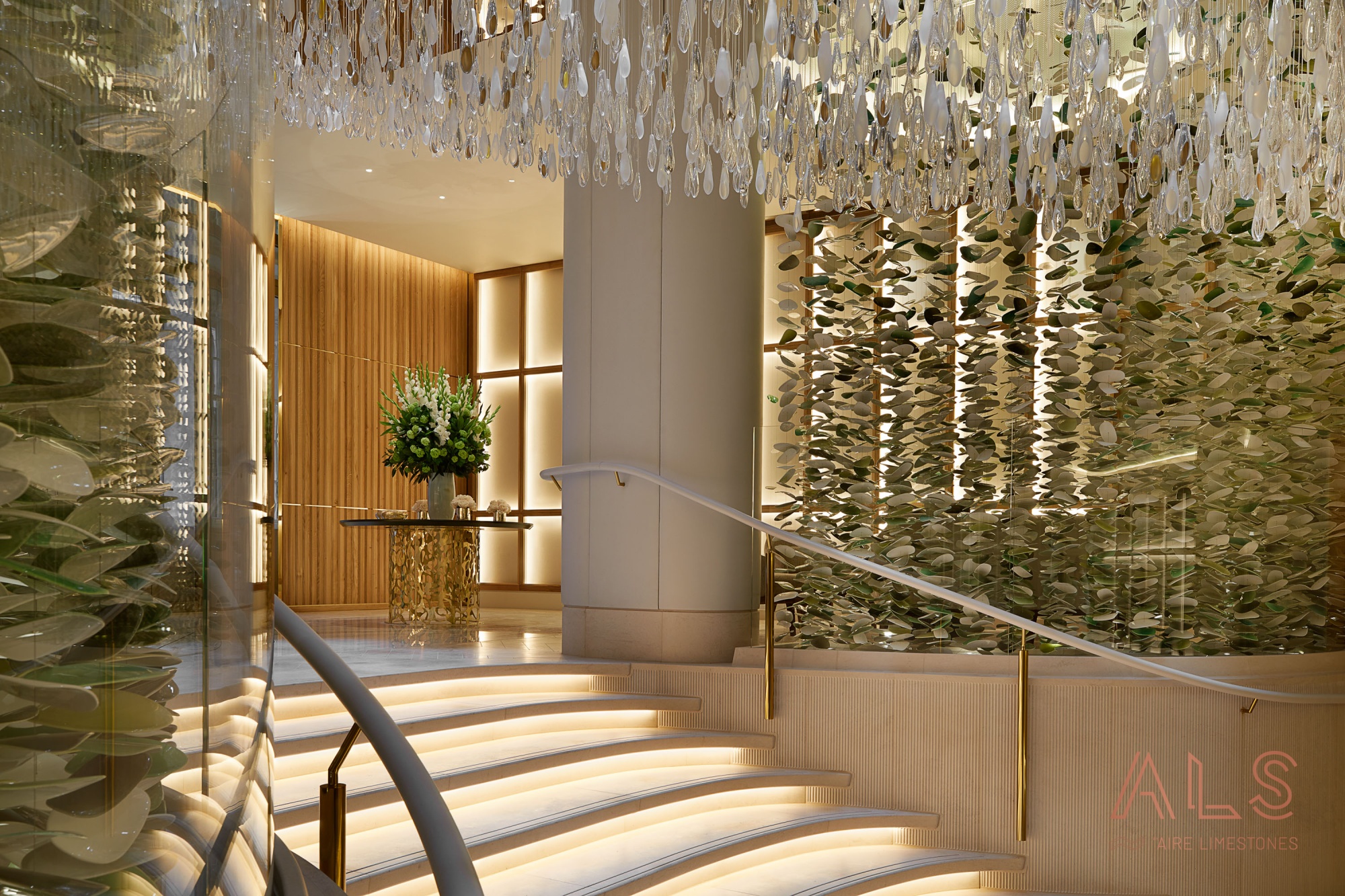 1250 mètres carrés pour le sol en chevron intérieur, le revêtement, les escaliers spéciaux, les étagères, les lavabos et autres travaux en pierre.