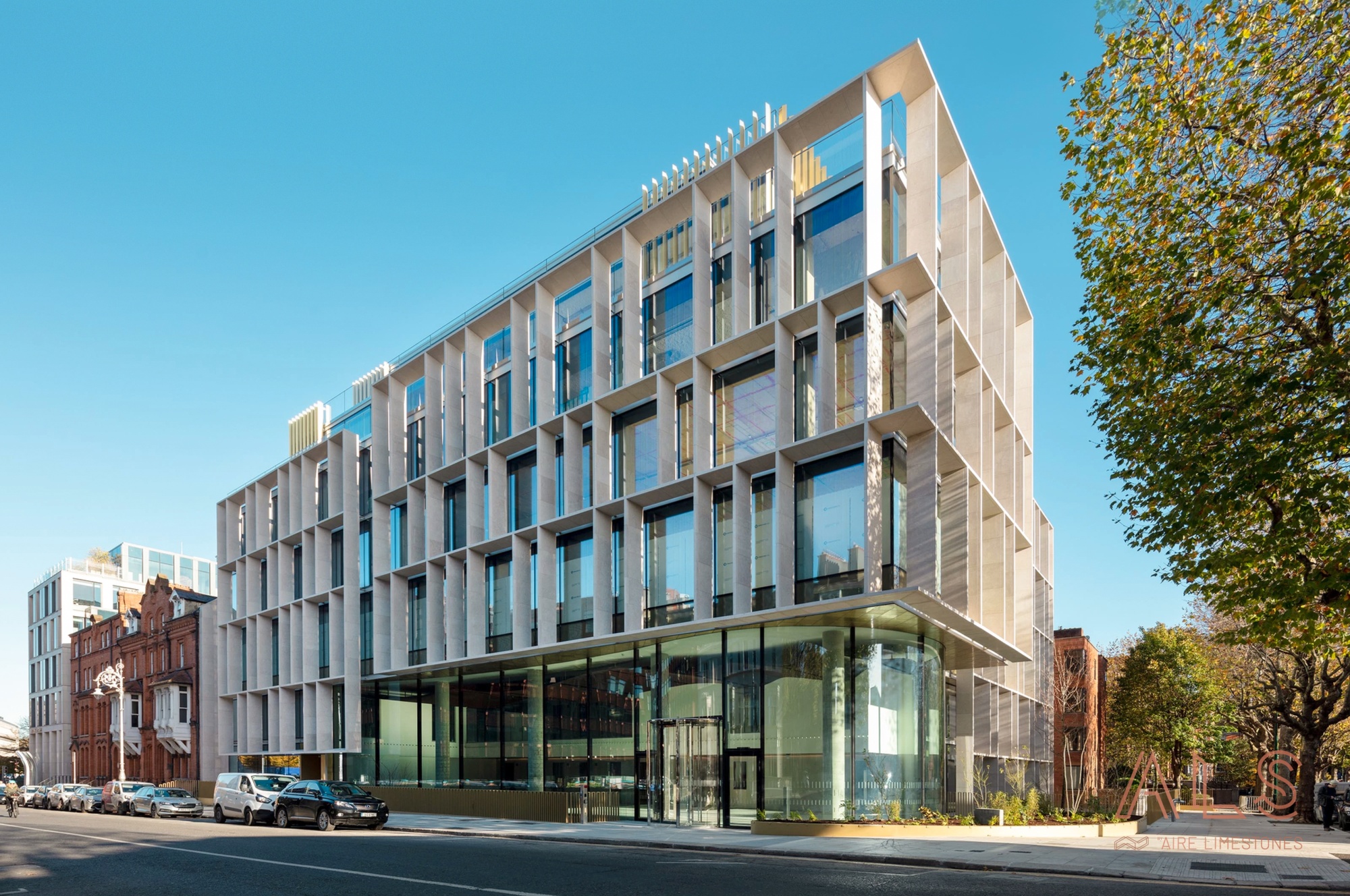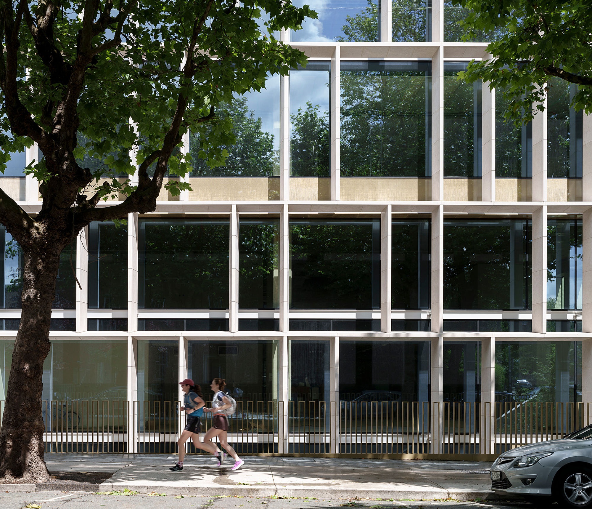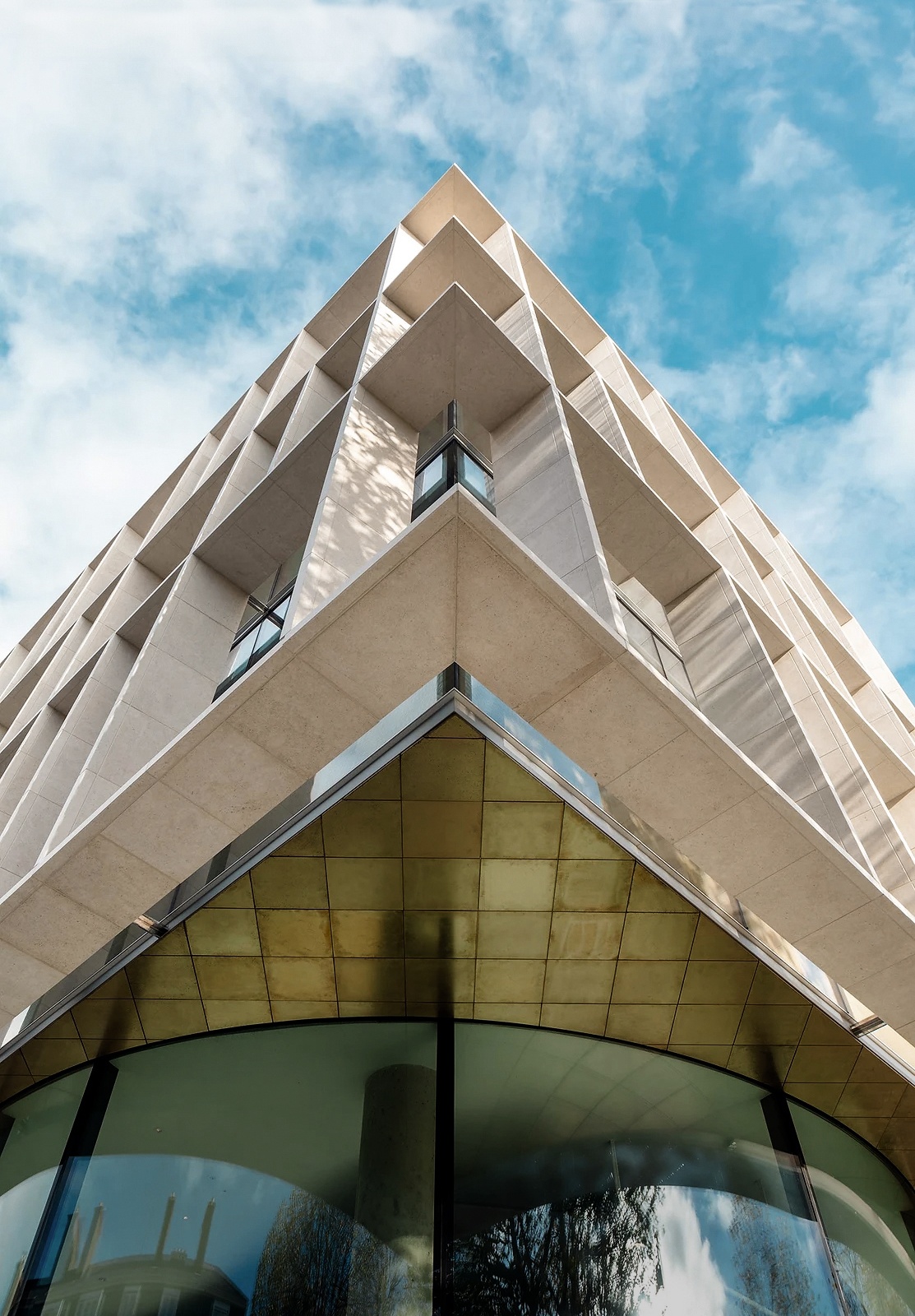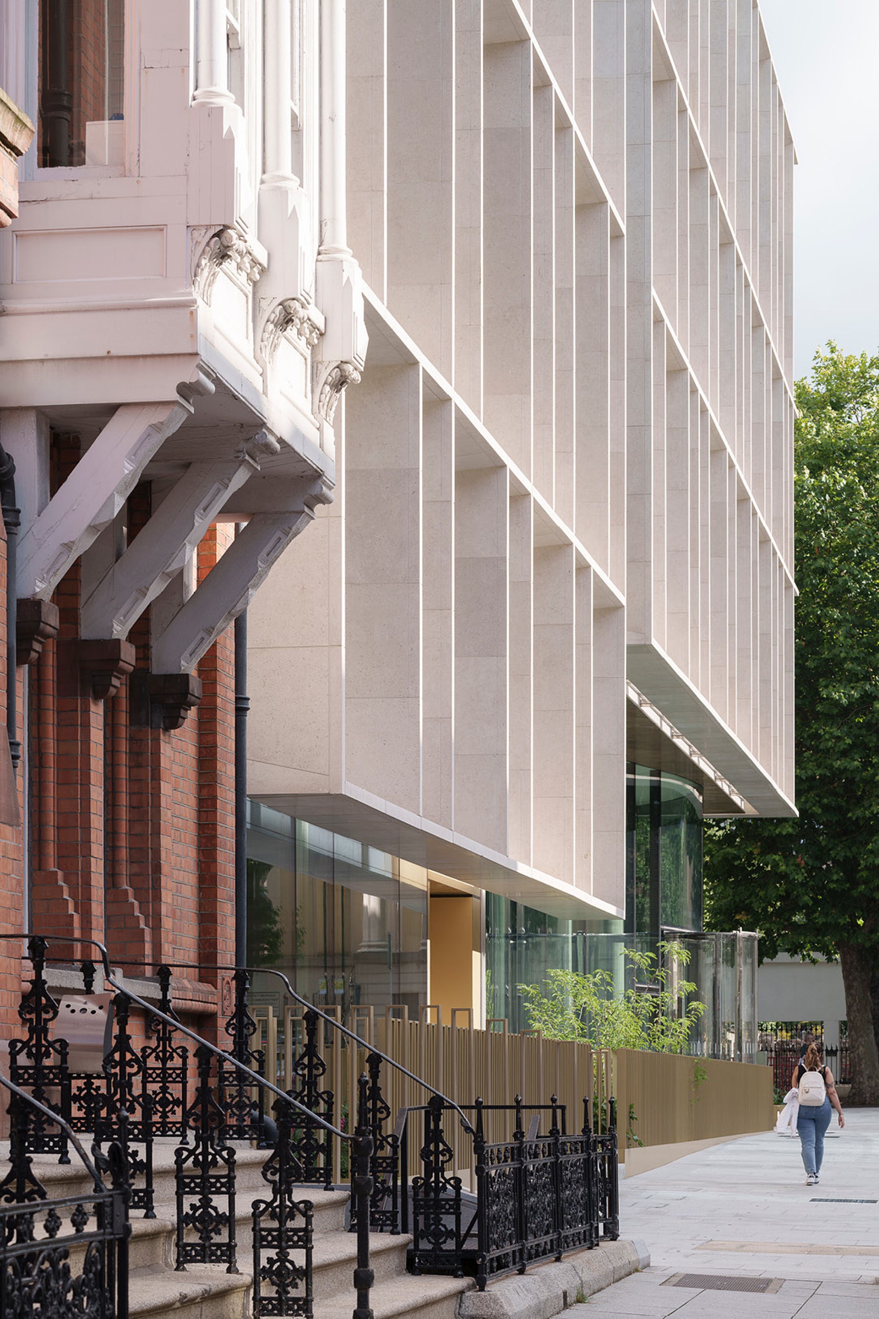Com uma grade súbtil suspensa que abraça o edifício, claramente a