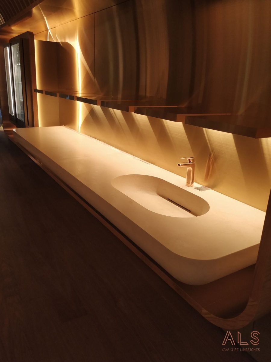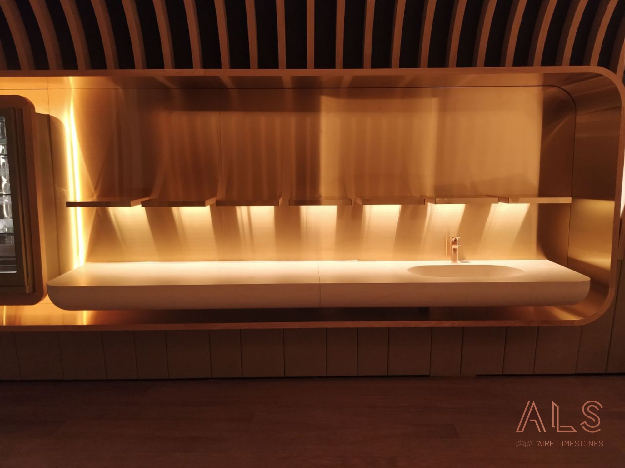 1250 metros quadrados de pavimento em chevron no interior, revestimento, escadas, prateleiras, lavatórios e outros trabalhos em pedra.